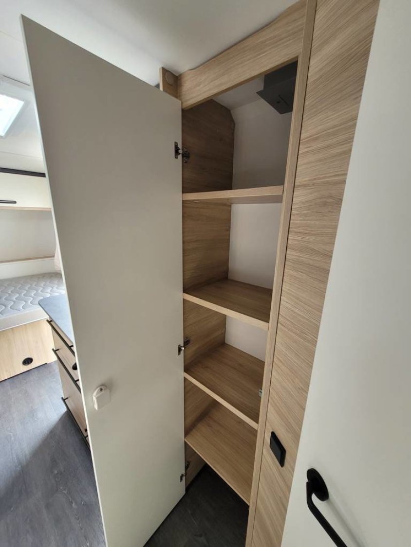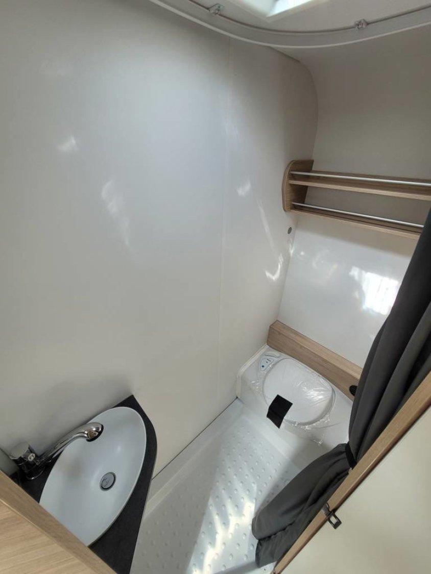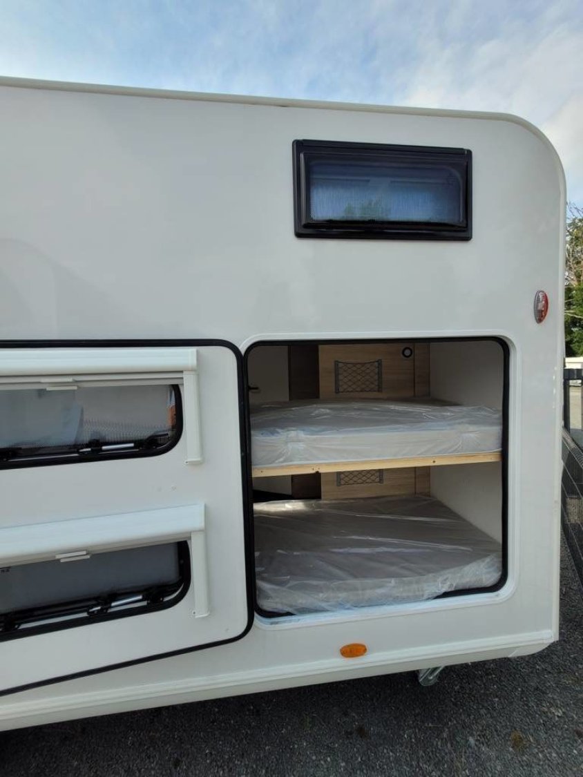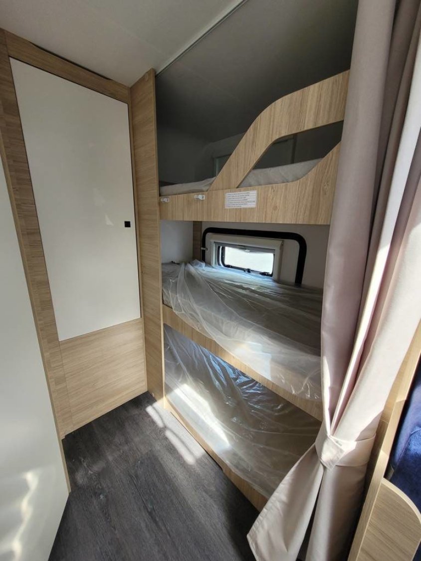 Bac de douche, Dînette milieu, Lit avant transversal, Lits superposés, WC cassette.