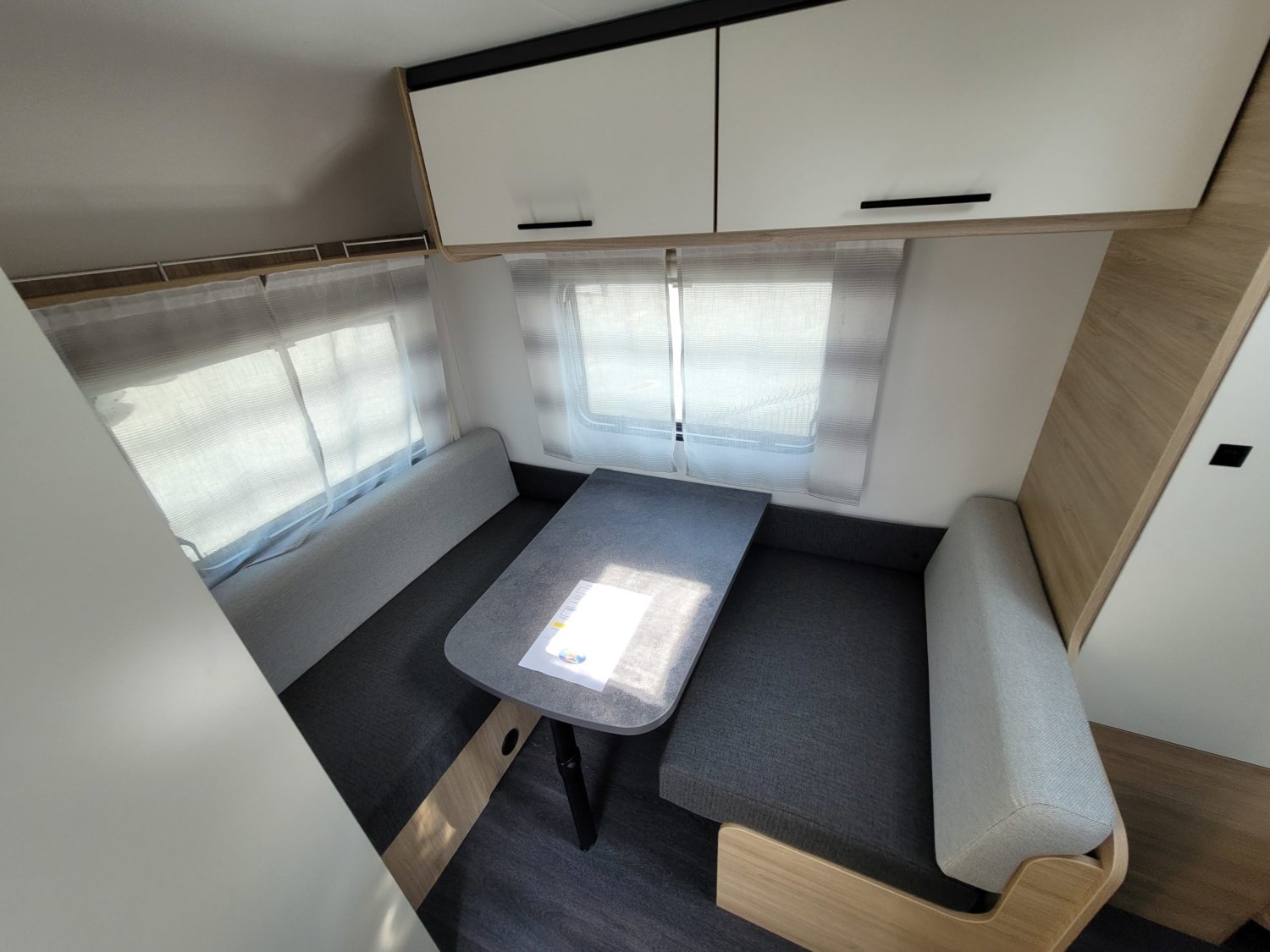 Bac de douche, Cuisine en long, Dinette arrière, Lit avant transversal, Lit dînette, WC cassette.