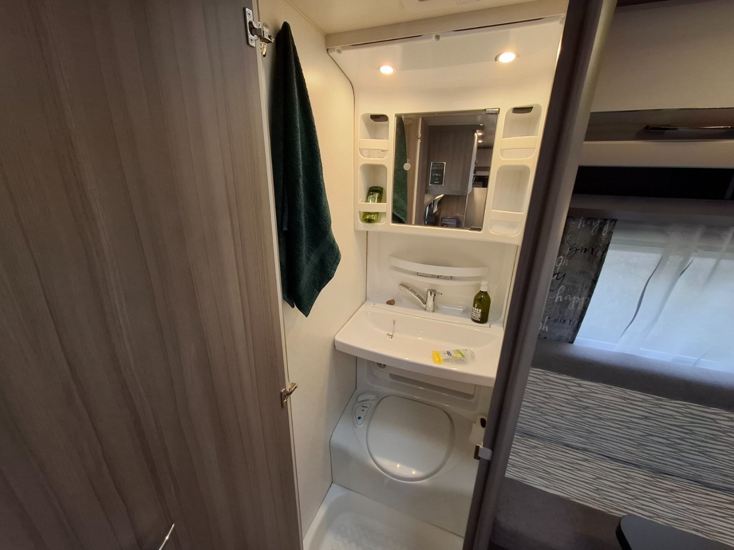Cabinet de toilette compact avec lavabo relevable, bac de propreté