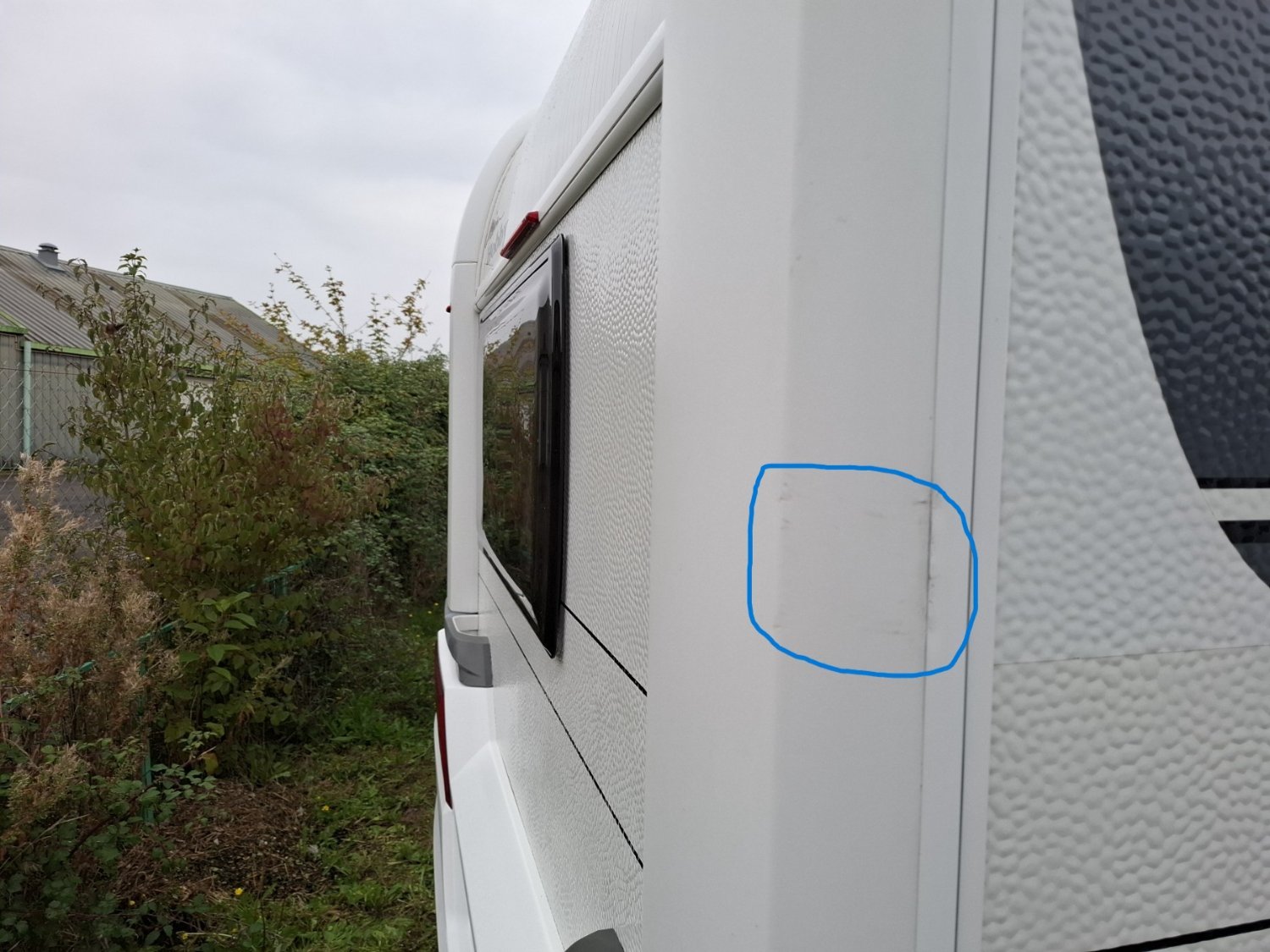 A noter, un défaut sur le montant arrière droit de la caravane, au milieu, suite à une manoeuvre maladroite. Nous l'avons illustré dans les photos décrivant la caravane. Le défaut est léger mais nous préférons l'illustrer.