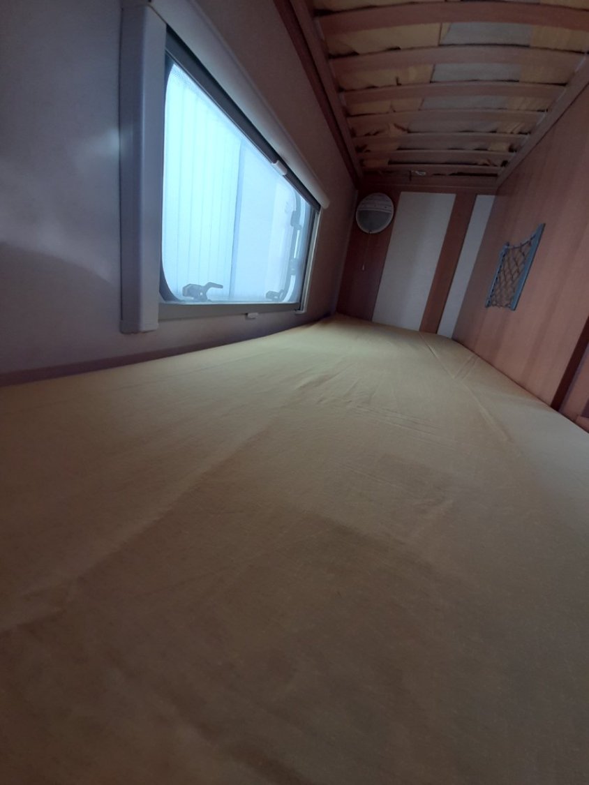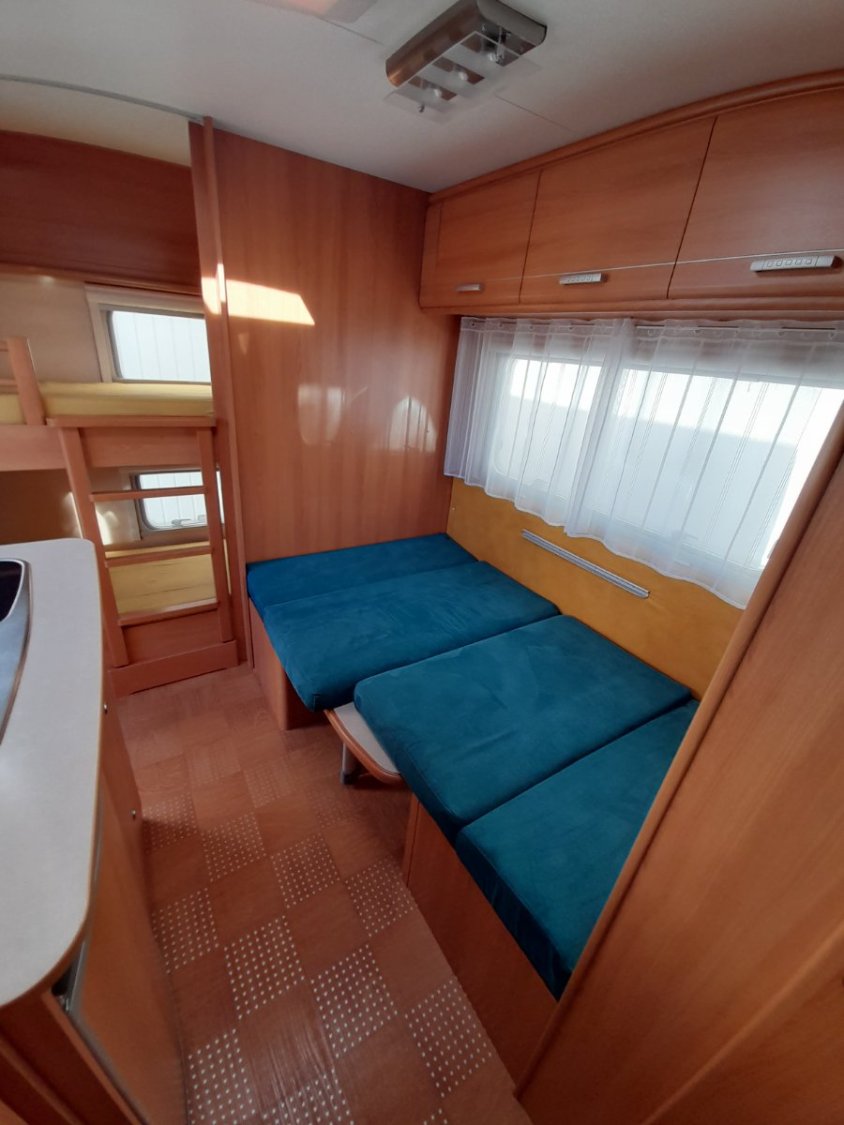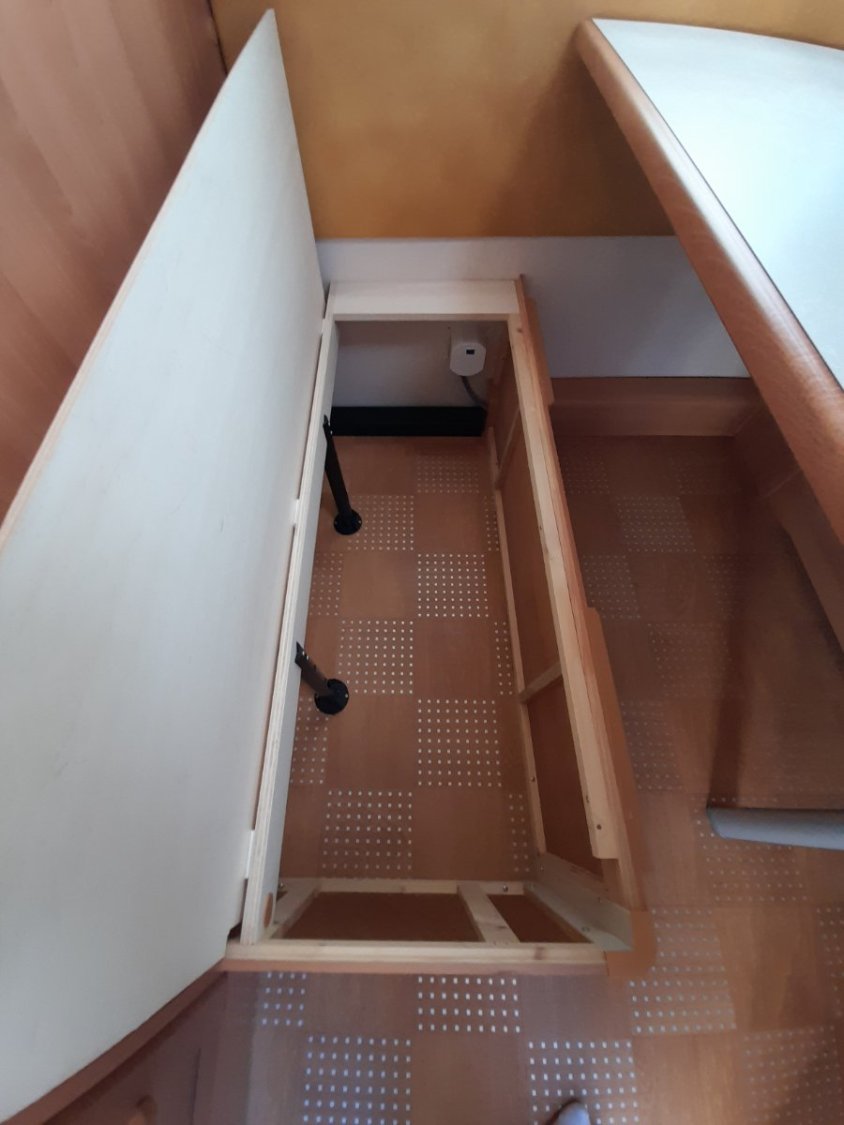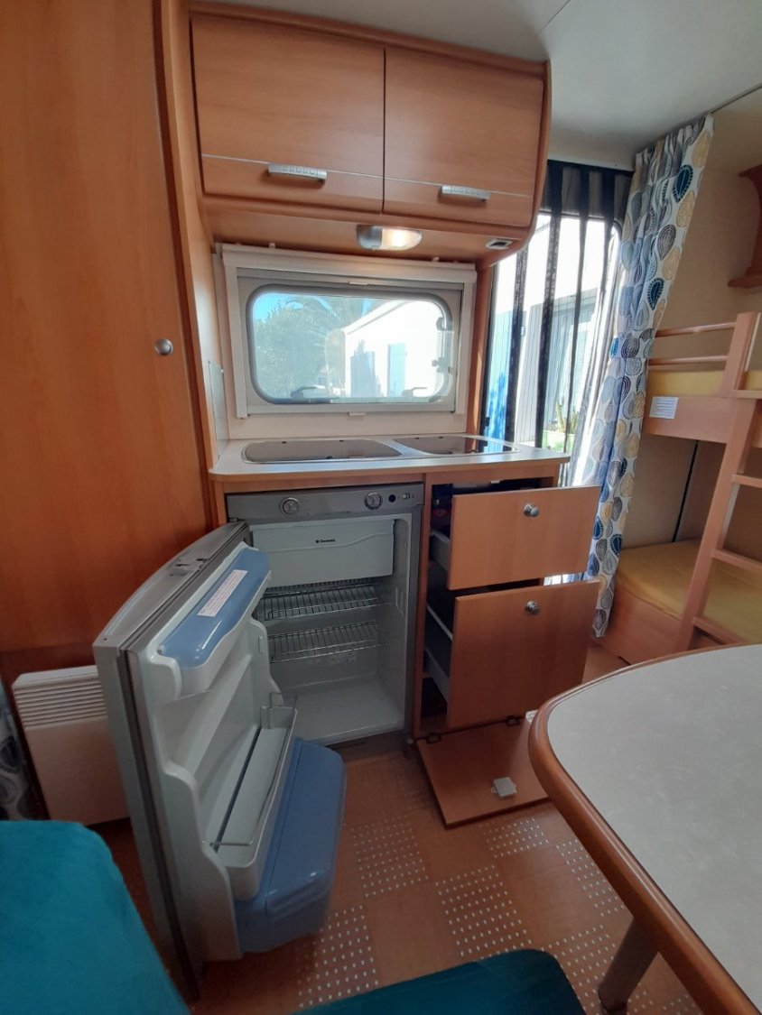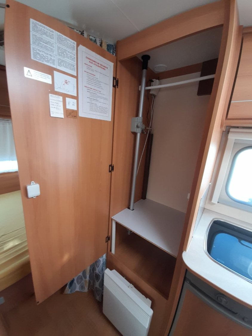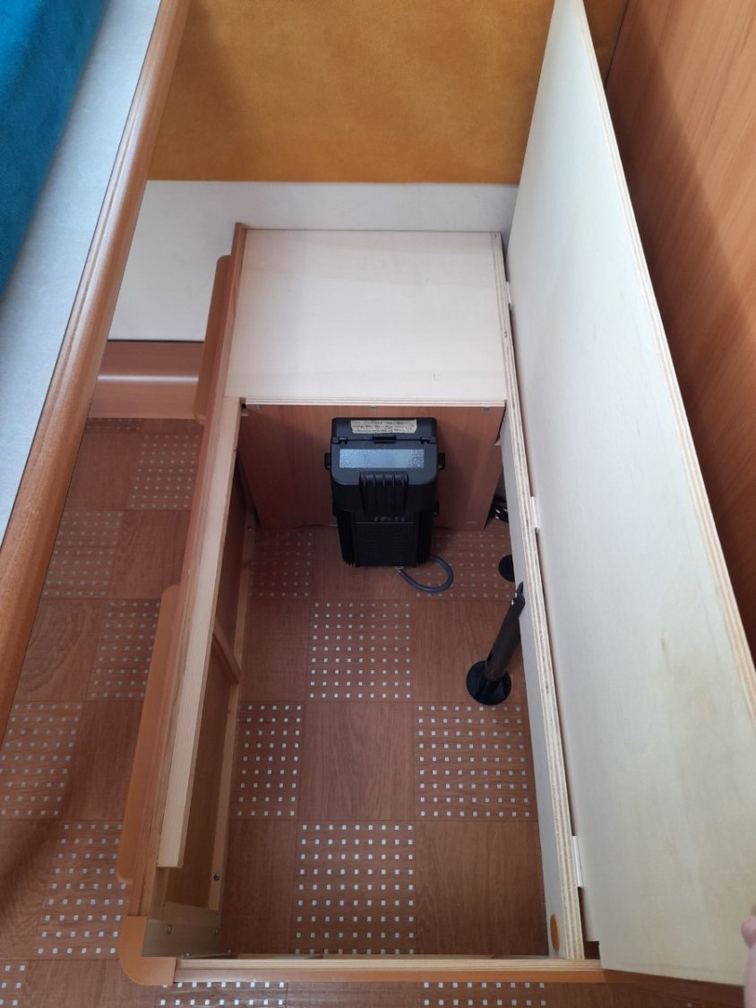 Nombreux rangements : 7 placards, 2 tiroirs, 1 penderie, 1 grand coffre sous le lit fixe, 1 soute au niveau des lits superposés, 2 coffres sous les banquettes et 1 grand coffre au niveau de la flèche.