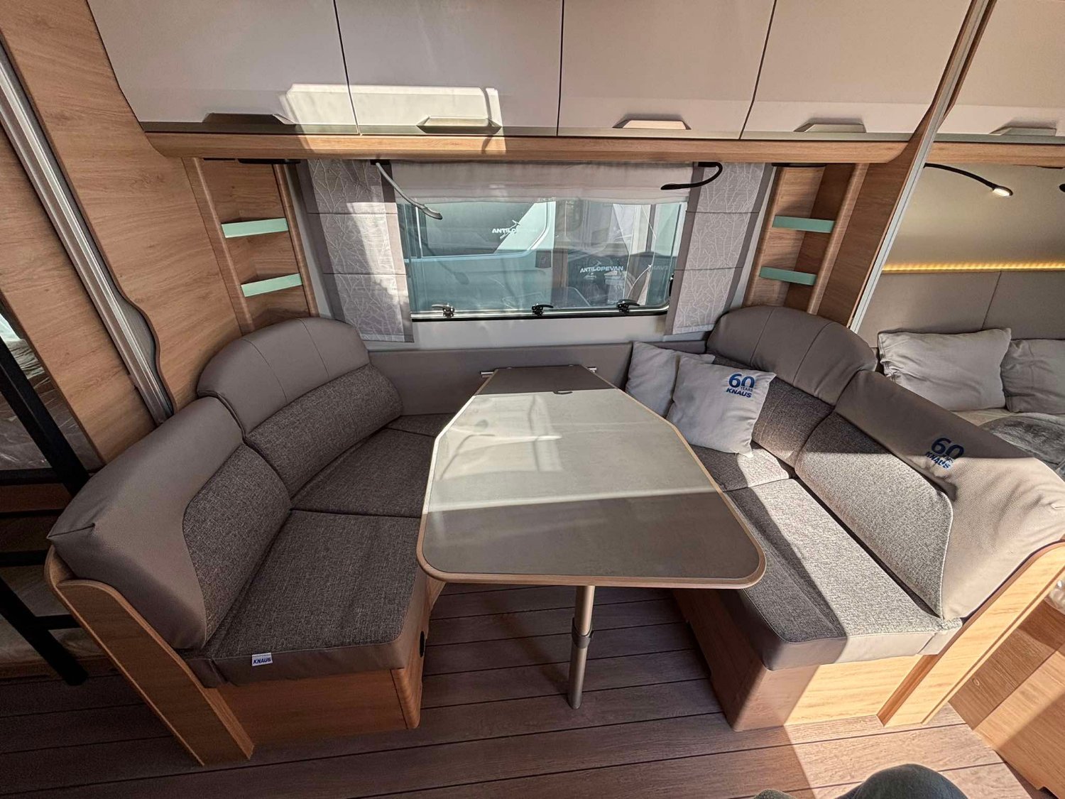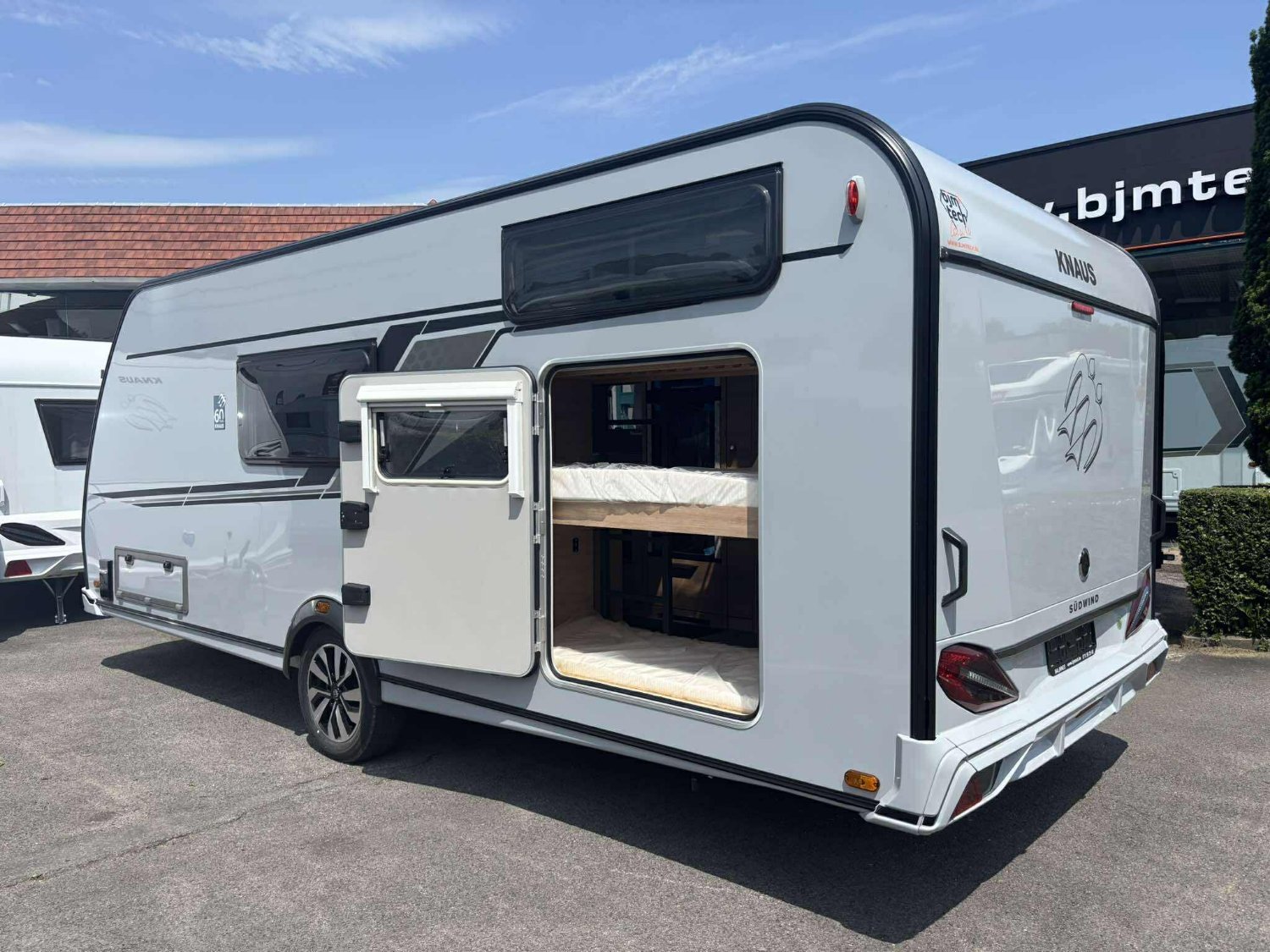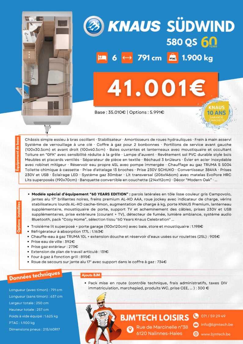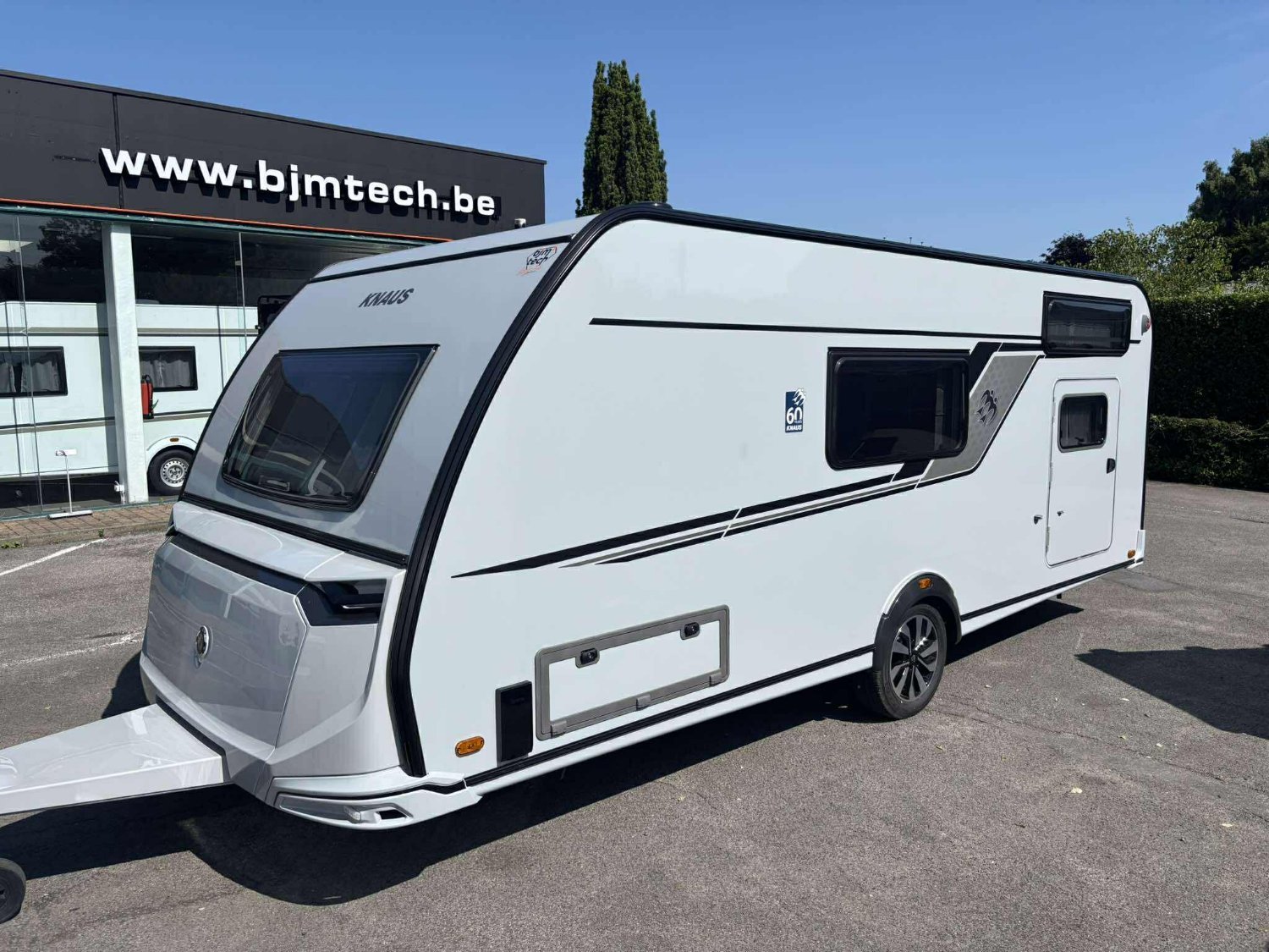 - Modèle spécial d’équipement “60 YEARS EDITION” : parois latérales en tôle lisse couleur gris Campovolo, jantes alu 17" brillantes noires, freins premium AL-KO AAA, roue jockey avec indicateur de charge, vérins stabilisateurs lourds AL-KO, cache-timon, augmentation de charge à 1.900kg, porte KNAUS Premium, lanterneau supplémentaire, moustiquaire de porte, support TV et acheminement des câbles, prises 230V et USB supplémentaires, prise extérieure (courant + TV), détecteur de fumée, lumière ambiance, système audio Bluetooth, pack “Cosy Home”, sélection tissu "60 Years Knaus Celebration" ...