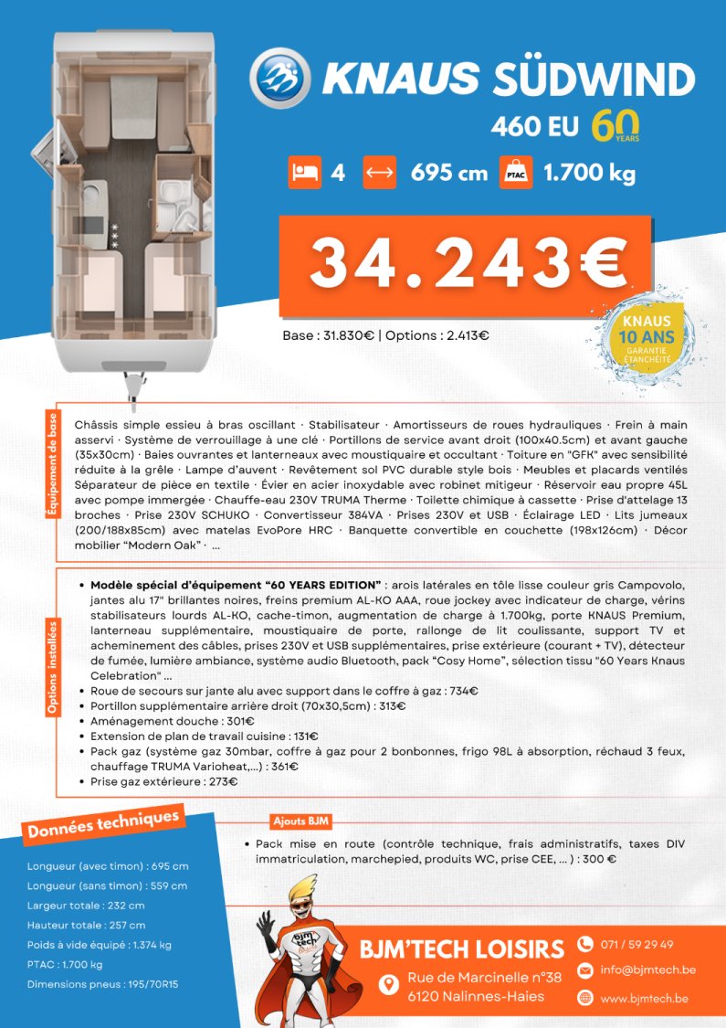 - Modèle spécial d’équipement “60 YEARS EDITION” : parois latérales en tôle lisse couleur gris Campovolo, jantes alu 17" brillantes noires, freins premium AL-KO AAA, roue jockey avec indicateur de charge, vérins stabilisateurs lourds AL-KO, cache-timon, augmentation de charge à 1.700kg, porte KNAUS Premium, lanterneau supplémentaire, moustiquaire de porte, rallonge de lit coulissante, support TV et acheminement des câbles, prises 230V et USB supplémentaires, prise extérieure (courant + TV), détecteur de fumée, lumière ambiance, système audio Bluetooth, pack “Cosy Home”, sélection tissu "60 Years Knaus Celebration" ...