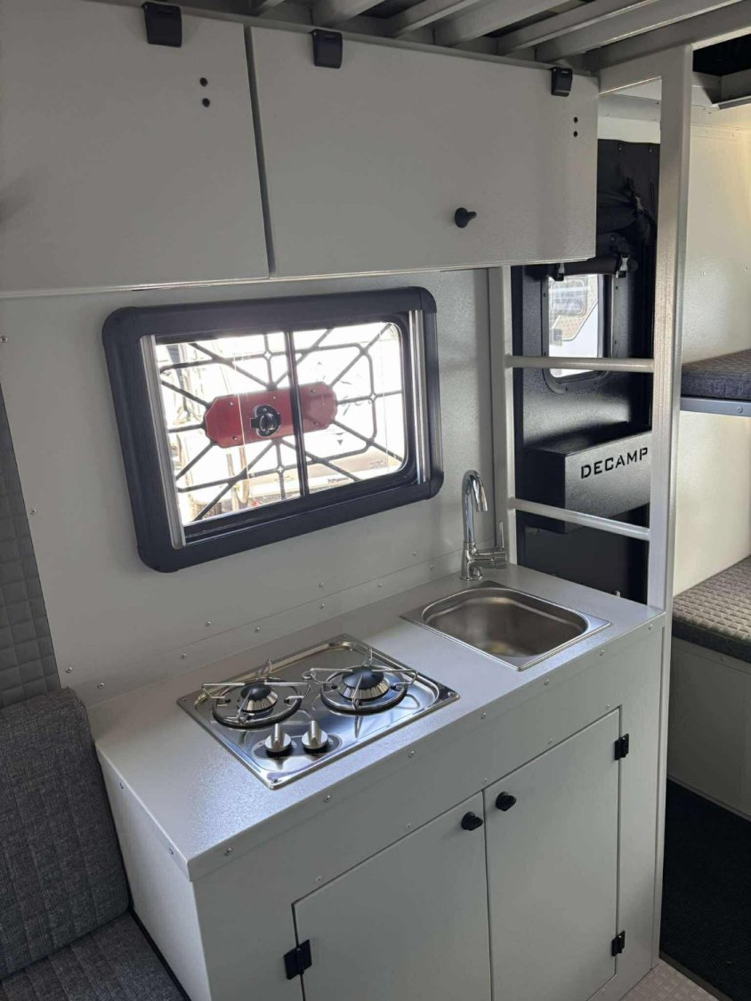 - Cuisine : 2 brûleurs gaz, évier couleur chrome, petit espace de plan de travail, rangements, prises 220V et USB