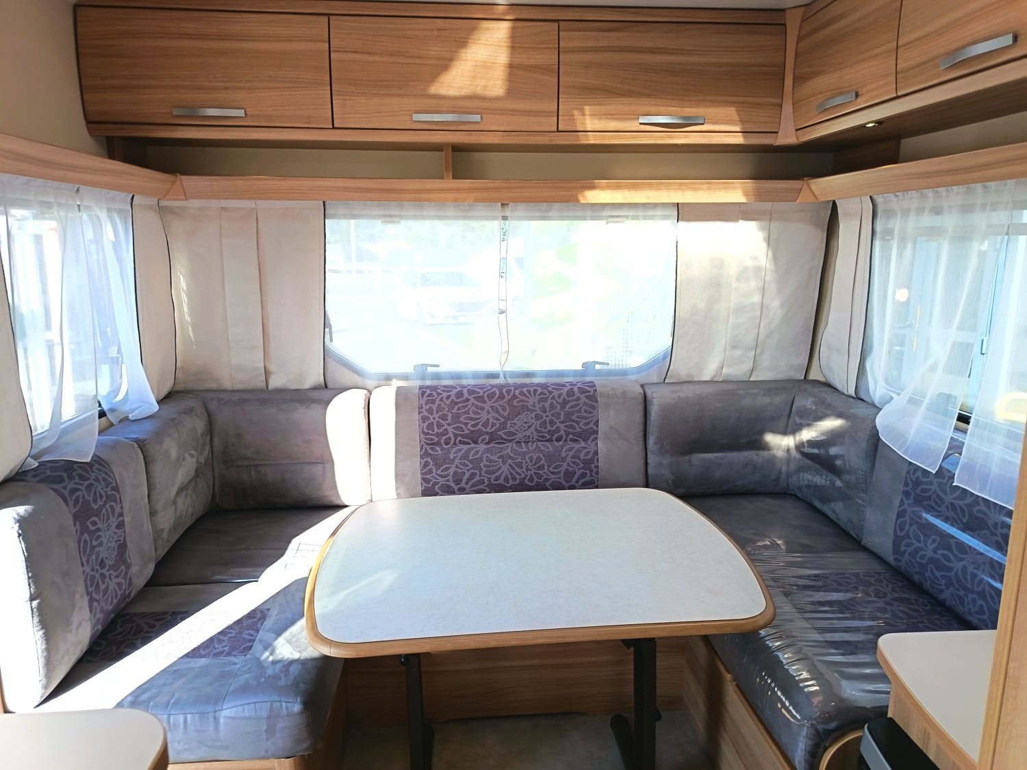 Très belle caravane avec lit central et salon U. Grande cuisine latérale avec frigo à compression de 150L. très bien isolée, extérieur en polyester pour une meilleure résistante et bel esthétique. Elle dispose également de nombreux accessoires de confort comme le auvent, le chauffage gaz et un chauffe-eau.