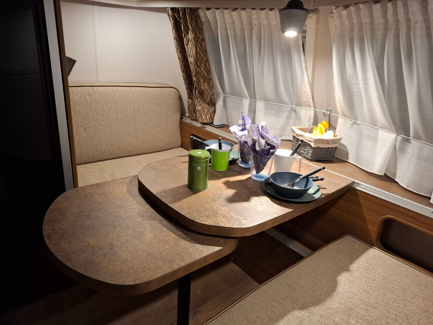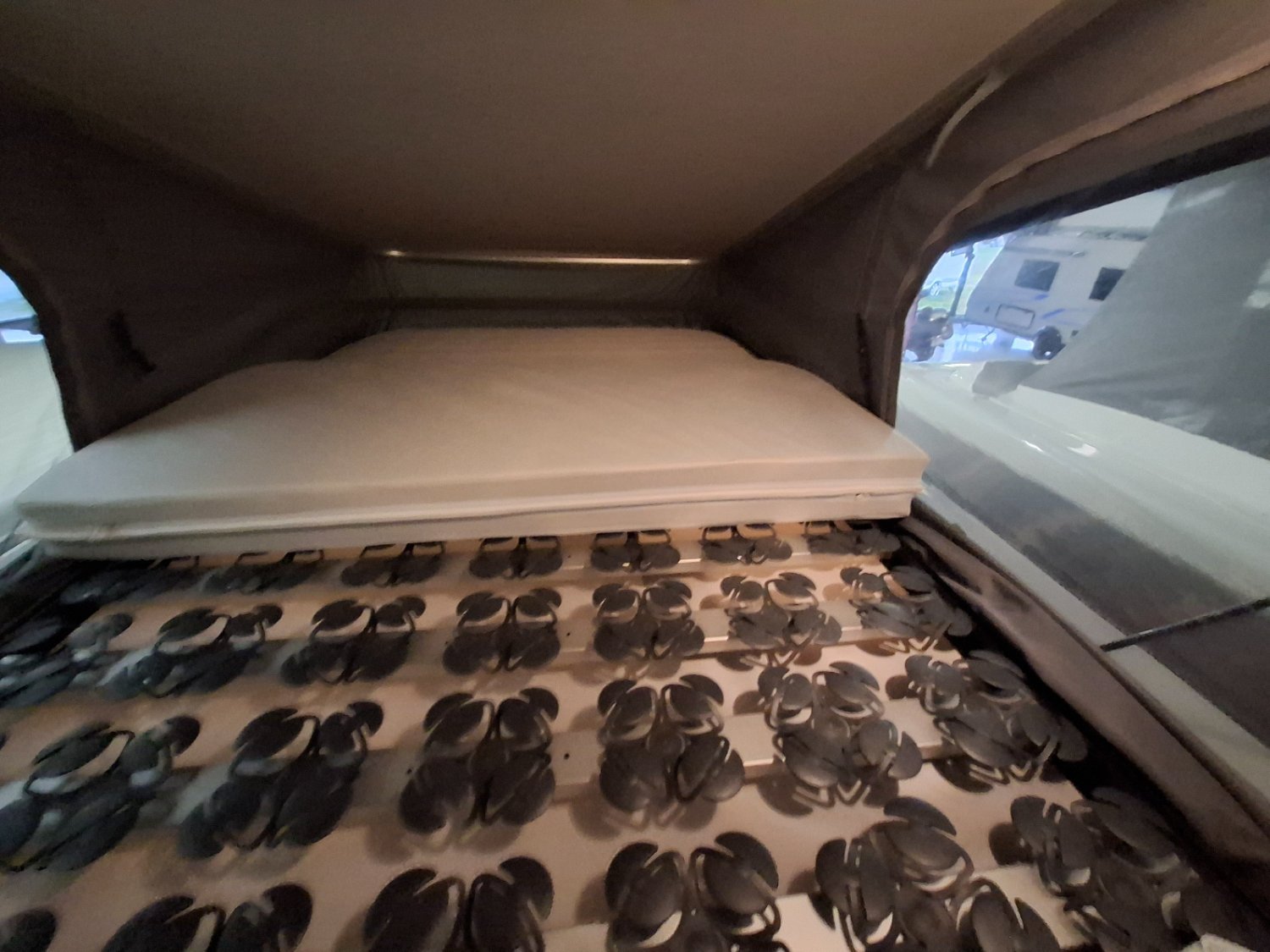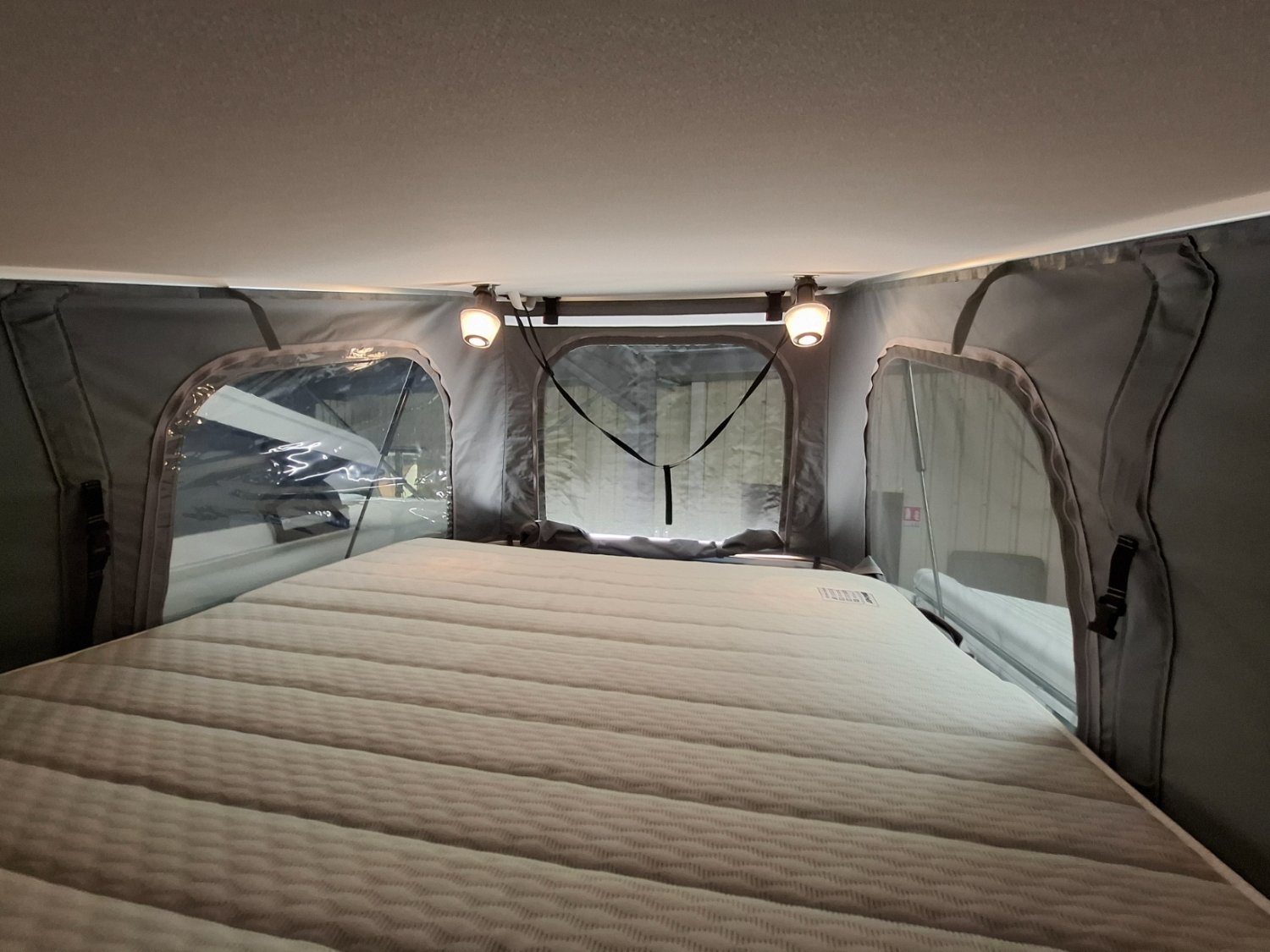 La caravane est équipée du coussin additionnel, amovible, pour former un couchage XXL.