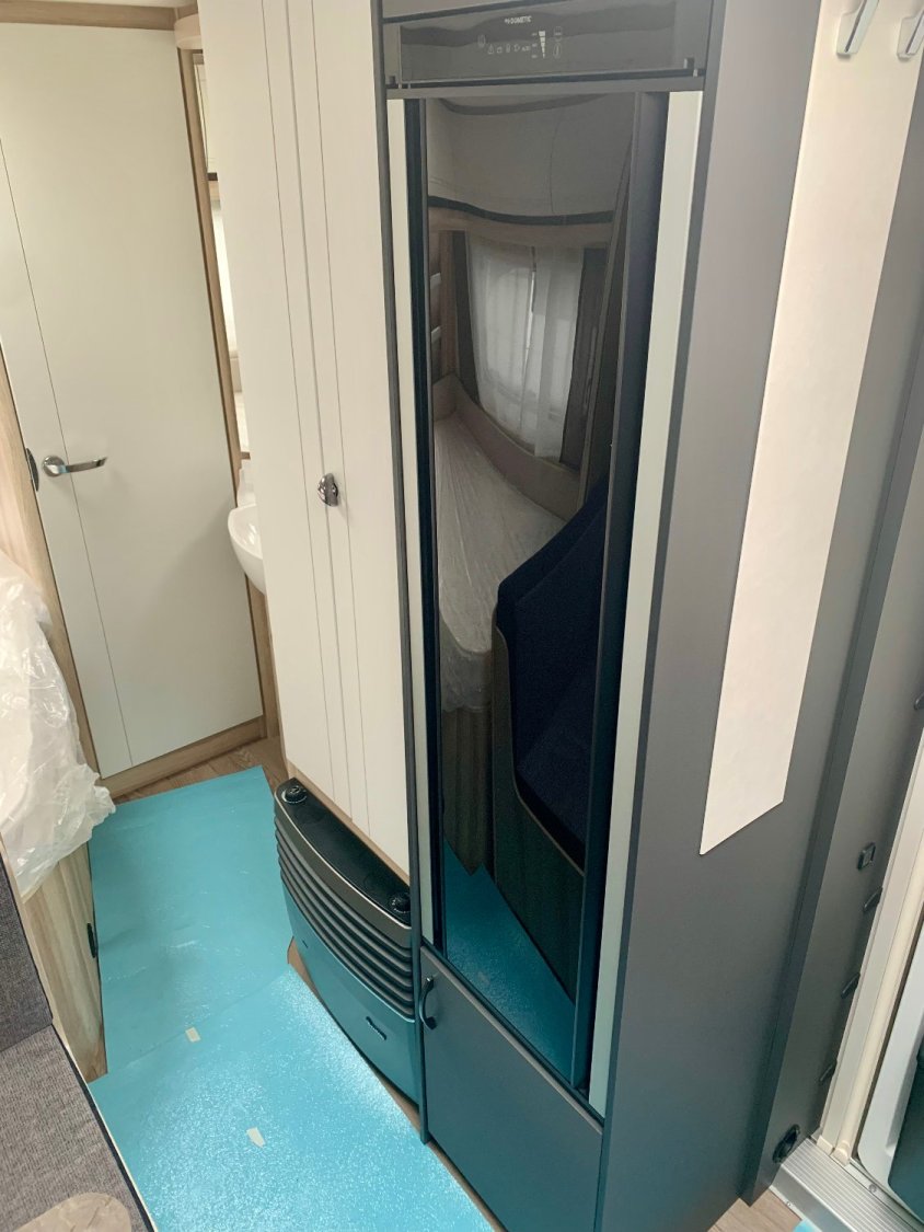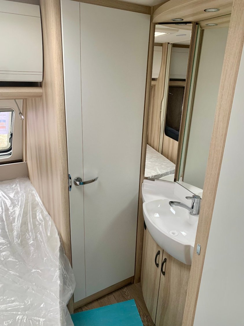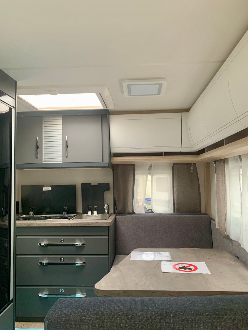 lit avant ,salon latérale , cuisine arrière ,cabinet de toilette avec wc cassette, lavabo externe , réfrigérateur 133l a ouverture double , chauffage gaz air pulser, chauffe eau.