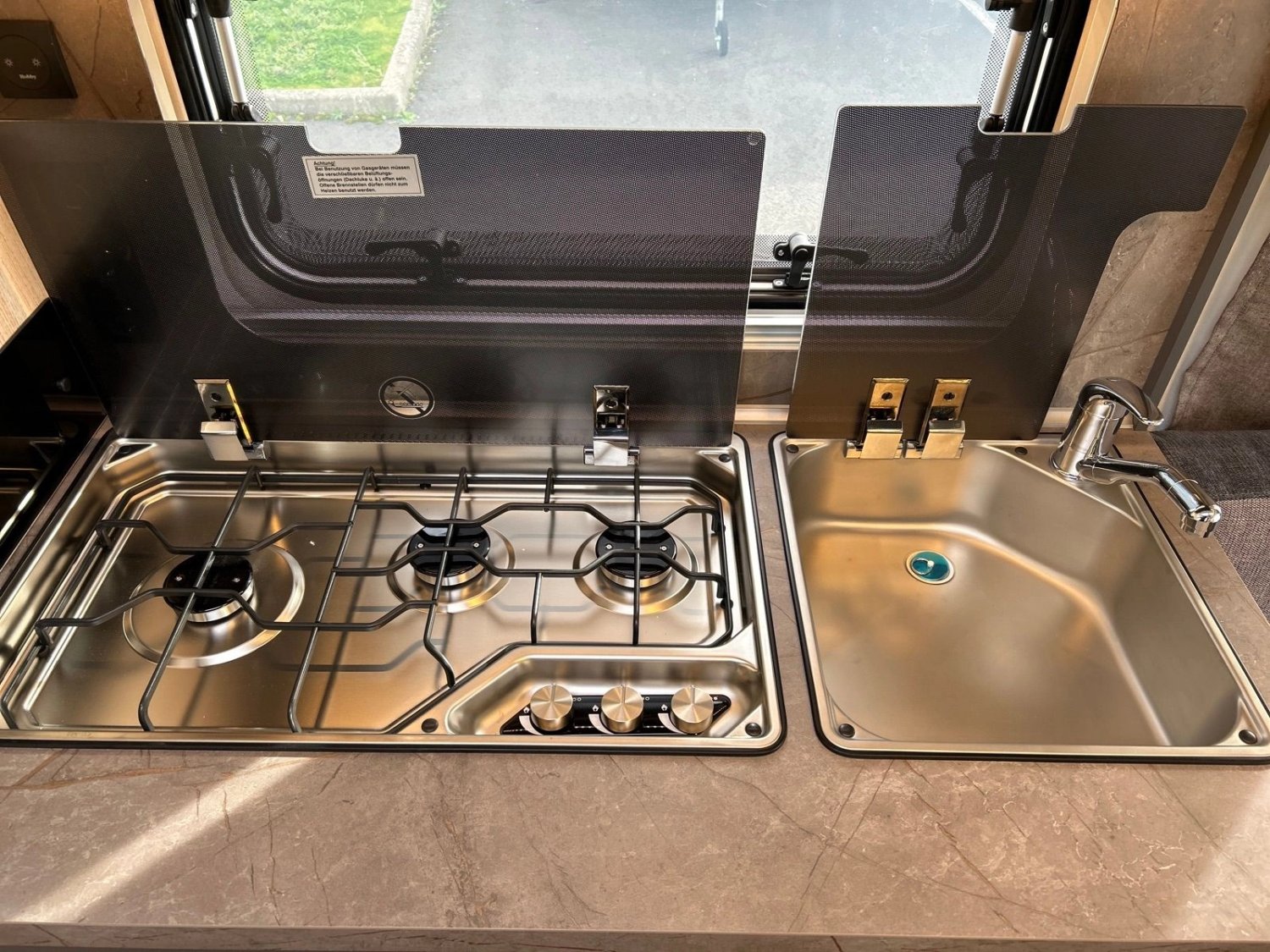 Réchaud et évier en inox, avec 3 feux, allumage électrique et abattant verre en deux parties
