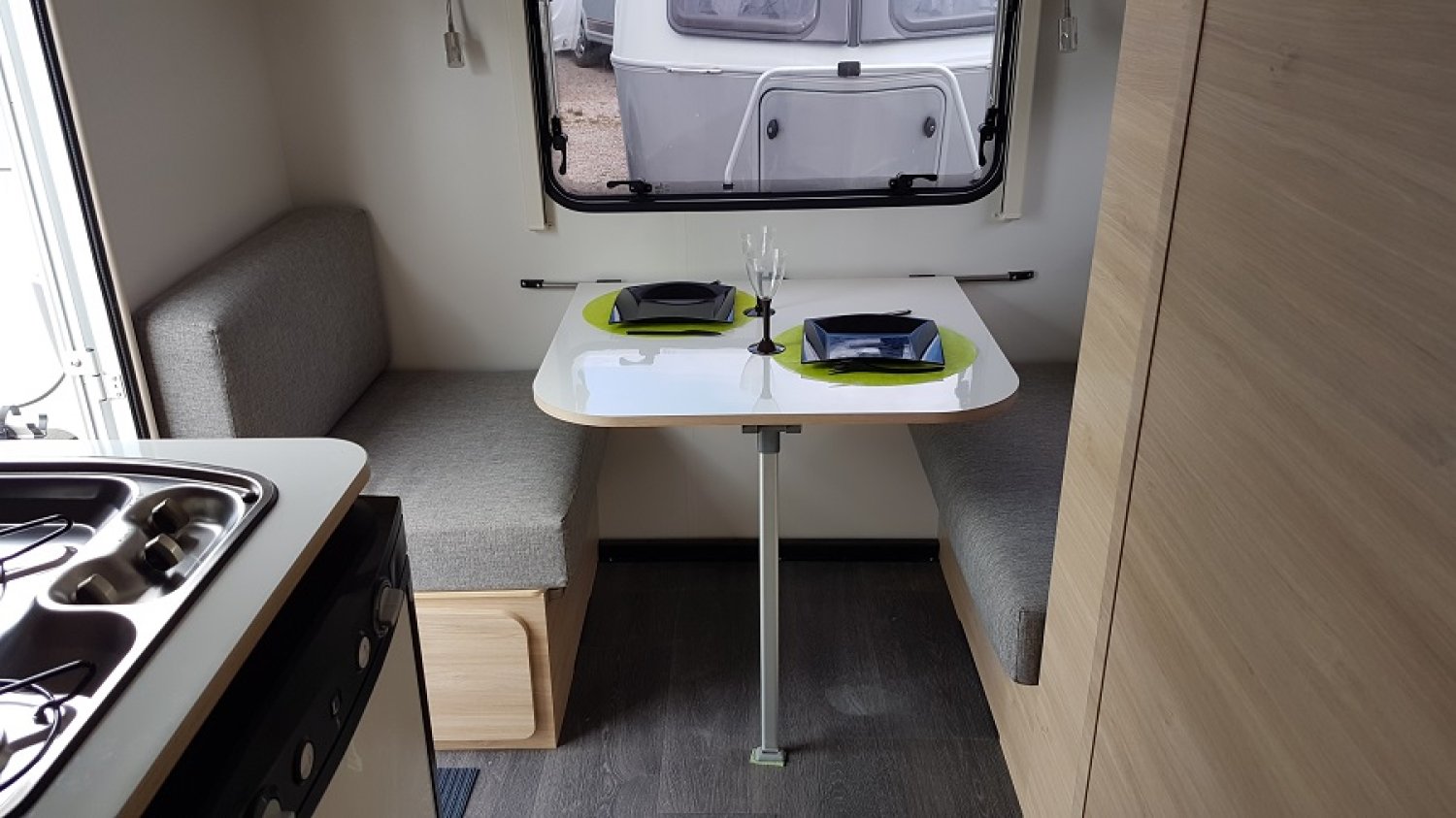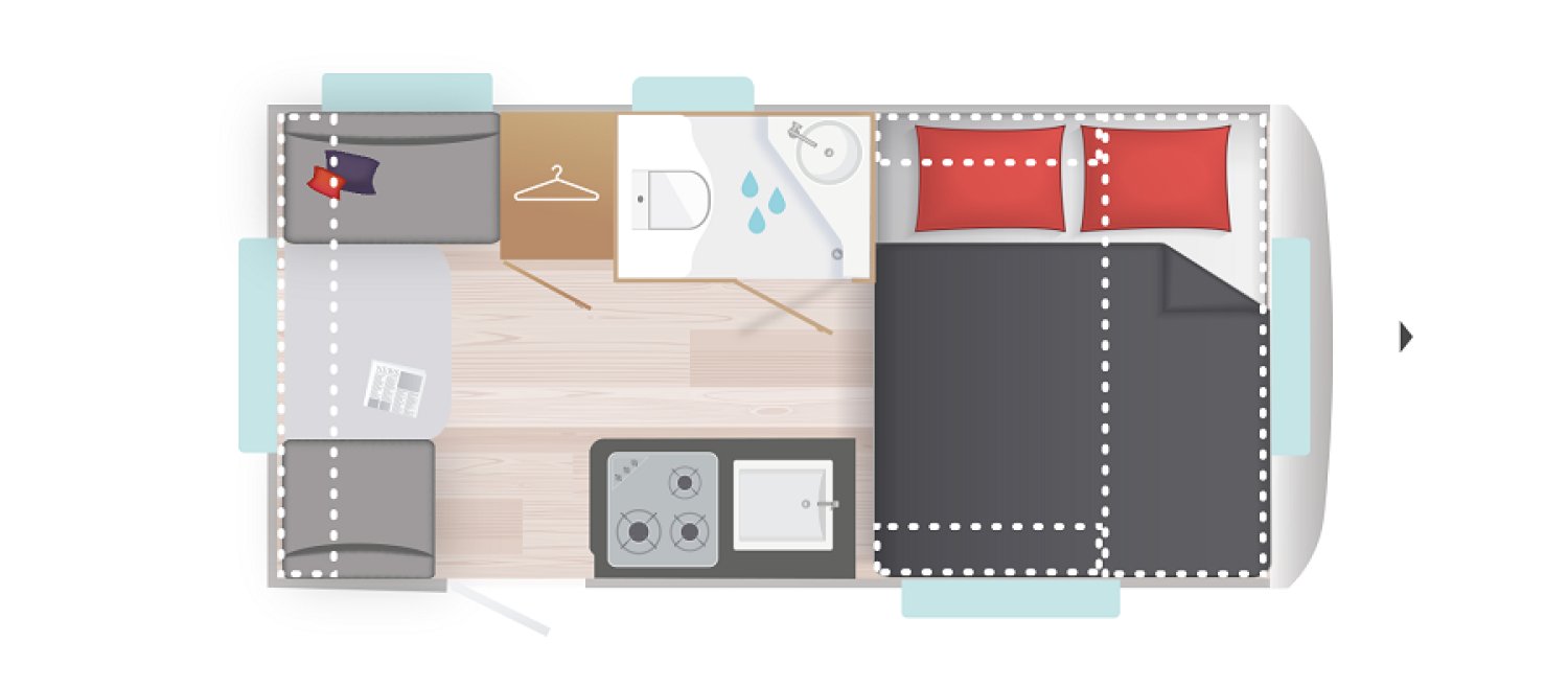 Idéale pour les couples, Elle offre un lit fixe transversal pour 2 personnes et une dinette arrière convertible en un couchage ce qui vous permet de dormir jusqu’à trois dans cette caravane de moins de 4m. Elle possède une cuisine équipée avec évier, plaque gaz et réfrigérateur 12/220/Gaz, un coin toilette avec lavabo, ainsi que de nombreux rangements ! Autrement dit, une caravane tout équipée dans des dimensions ultra compacte sans négliger le confort !